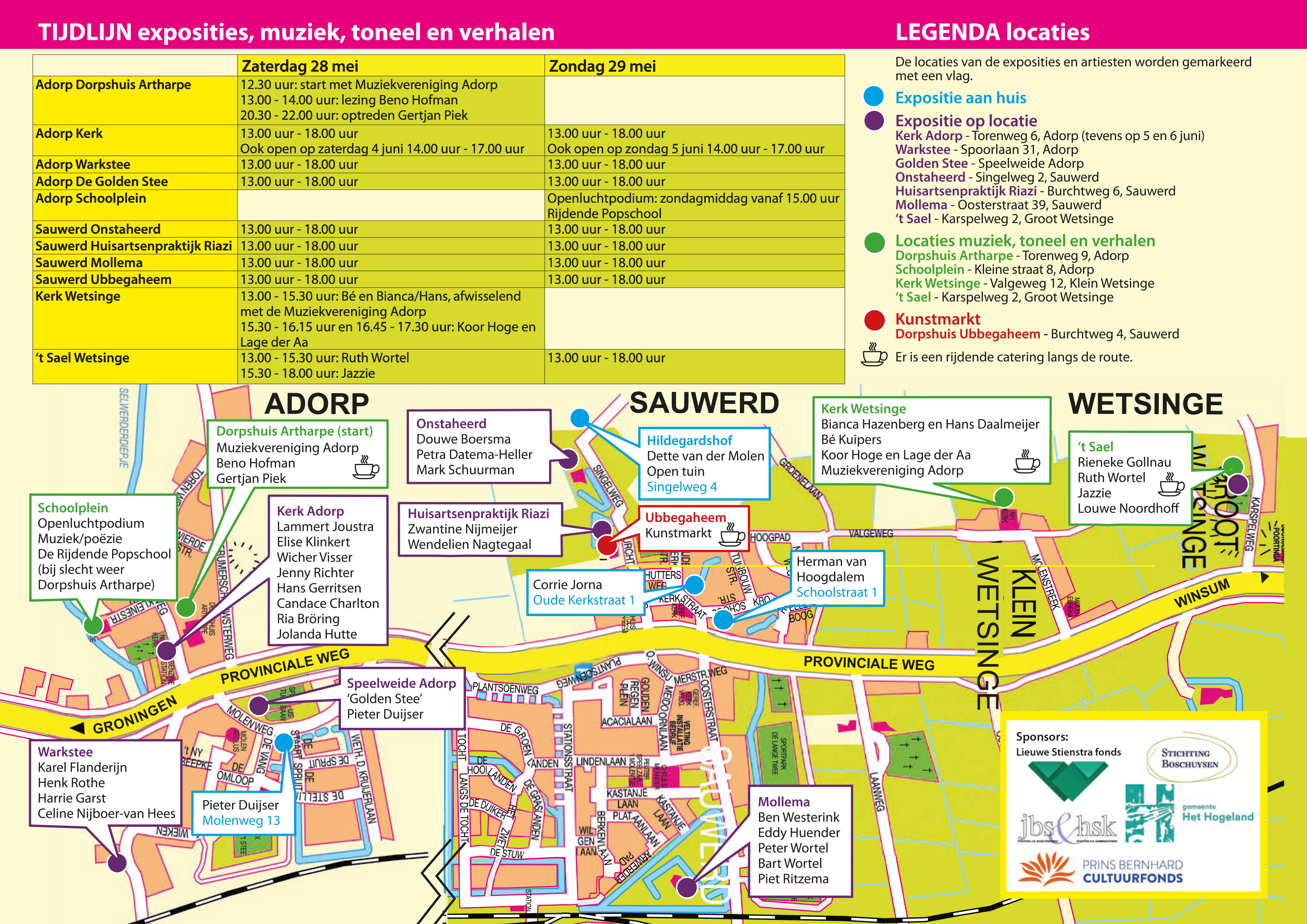 Dan zijn er op beide dagen van 13.00 tot 18.00 uur kunstwerken te zien, die gemaakt zijn door inwoners van de dorpen. Op een aantal plekken is dat aan huis. Daarbij gaat het om locaties in Sauwerd aan de Oude Kerkstraat 1, waar Corrie Jorna exposeert en de Schoolstraat 1, waar werk is te zien van Herman van Hoogdalem. Dette van der Molen zet verder haar tuin Hildegardshof aan de Singelweg 4 open.